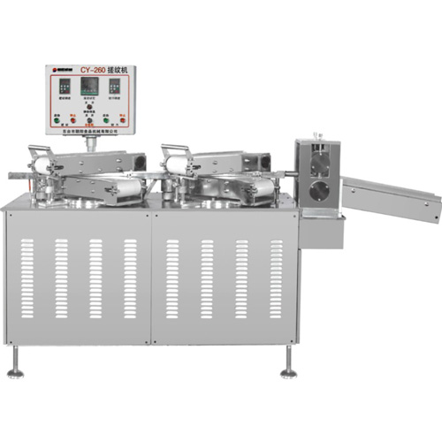 该设备是一种糖条搓纹机,搓出的糖条可生产各种螺纹状花糖。该机搓出的糖条粗细均匀、纹理清晰、条纹匀称,切出的糖条长度可以任意调整(在不停机的状态下),从而解决了各糖果生产厂家生产各种花式的需求。