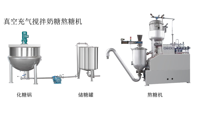 该机组为不锈钢材料制造,将传统充气糖果的加热、浓缩、冲浆、搅拌、混合等通过机、电、气、仪合理配置,是充气糖果熬煮的关键设备。配备电脑PLC自动控制装置,触摸屏操作,其真空熬煮、充气搅拌均能自动交替进行,可对糖浆进行高充气或低充气熬煮,也可根据需求增配熬煮锅用于炼乳等辅料的添加。该机具有较高的控制精度,因此通过该机熬煮的糖浆具有很好的质量。该机适用于奶糖、牛轧糖、水果糖、棉花糖、糖排心料及类似糖果的充气熬煮。